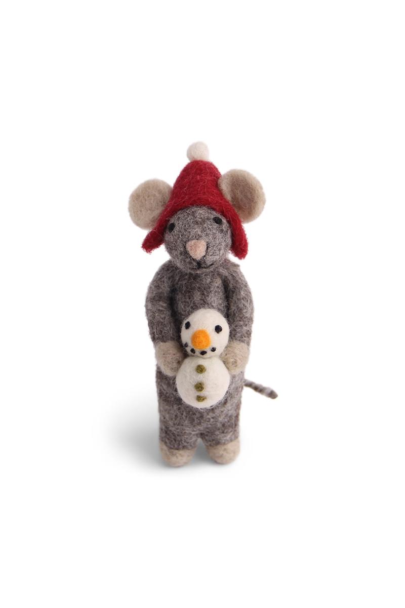 Cute grey mouse with a snowman, made of felted wool. The mouse wears a red hat and features many lovely details.Handmade in Nepal and Fairtrade certified.
