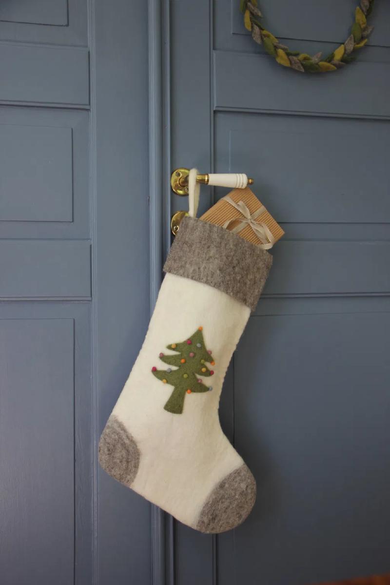 A classic Christmas stocking adorned with a felted tree, perfect for filling with tiny treasures. Handmade and filled with the spirit of the season, it’s a piece to cherish year after year